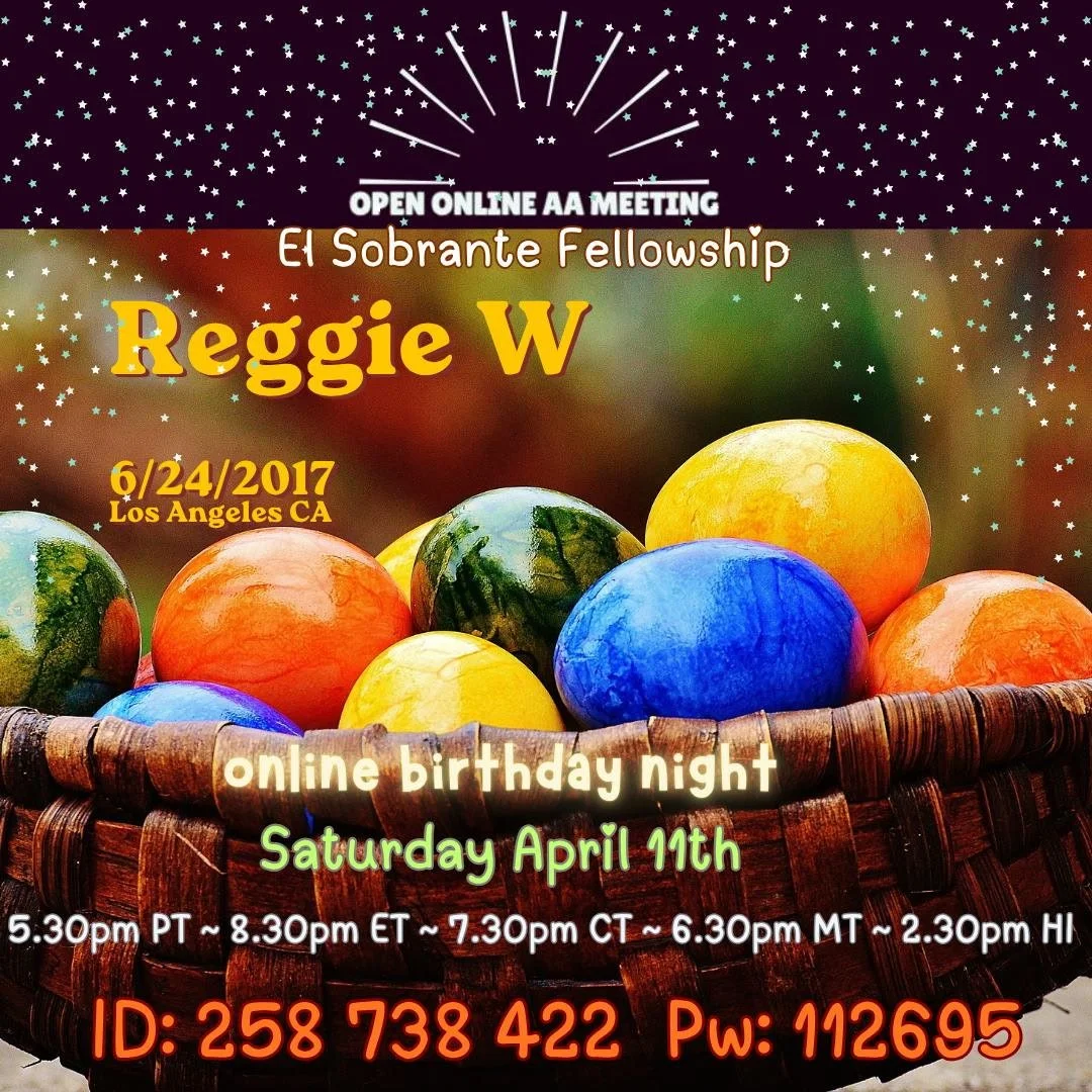Back to All Events Online Birthday Night Saturday, April 11, 2026 5:30 PM 6:30 PM Google Calendar ICS Celebrate your sobriety birthday online! Join us every 2nd Saturday of the month at 5:30pm for a 40 min speaker and sobriety time celebration. Contact the meeting host to have your sobriety chip mailed to you. Zoom Meeting ID: 258 738 422 Password: 112695 Join Meeting Join Meeting