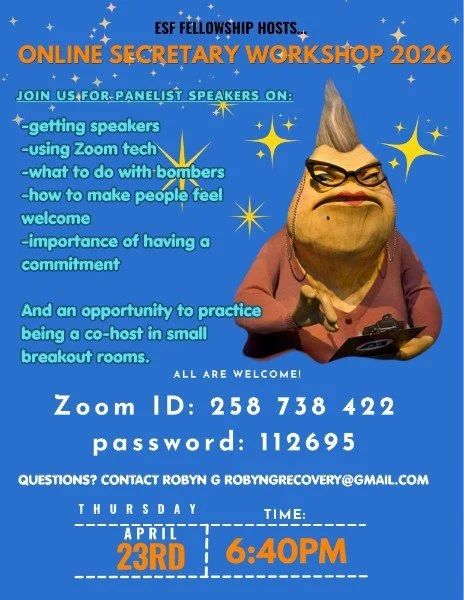 Online Secretary Workshop Thursday, April 23, 2026 6:40 PM 7:40 PM Google Calendar ICS Joins us for panelist speakers on how to effectively secretary online meetings, covering getting speakers, using technology, handling issues, and more! Zoom Meeting ID: 258 738 422 Password: 112695 Join Meeting